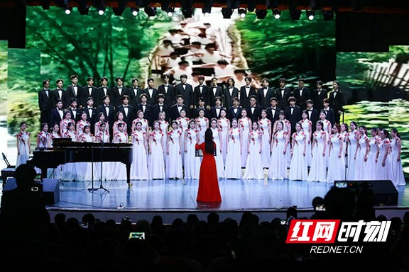 音乐会主题鲜明,分为两大篇章。上半场“熟悉的湘谣”聚焦湖湘文化根基,合唱团以青年学子的热忱,系统演绎了《垦春泥》《一根竹竿容易弯》等经典湖南民歌。这些曲目凝结着湖湘记忆,由田汉、贺绿汀、白诚仁、谢源等名家创作或编配。合唱团成员们凭借纯净而富有感染力的歌声,精准诠释了民歌中蕴含的田园劳作场景、质朴民风与地域文化特色,带领观众沉浸于三湘四水的独特韵味之中,展现了青年一代对本土音乐文化遗产的珍视与传承。